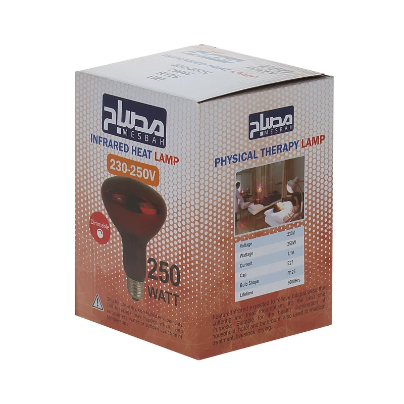 لامپ مادون قرمز 250 وات مصباح، با کیفیت ترین لامپ مادون قرمز موجود در بازار دنیاست. سرپیچ این لامپ از مدل سرپیچ معمولی (E27) است و برای روشن کردن آن بهتر است از سرپیچ سرامیکی استفاده شود. قطر بالای این لامپ 125 میلیمتر و ارتفاع آن 173 میلیمتر می باشد. کاربرد اصلی لامپ های مادون قرمز، برای دستگاه های فیزیوتراپی برای رفع دردهای عصبی، سرماخوردگی، تمرینات ورزشی و استراحت عضلات است و کاربرد درمانی دارد و برای همین کاربرد نیز طراحی شده است. اشعات مادون قرمز بعد از برخورد با سطح پوست به صورت گسترده پخش شده و باعث ایجاد گرمای لذت بخشی بر سطح پوست می شود. گرمای حاصله باعث دور شدن مواد زاید و ایجاد آرامش در اعصاب و بهبود گردش خون می گردد. امواج مادون قرمز می توانند از تمام لایه های پوست عبور کرده و به صورت مستقیم با گلبول های آب و خونی داخل عضلات در ارتباط باشند و تاثیر مستقیم بر فرایند درمان بگذارند. این لامپ در محیط های رستورانی و تفریحی که در محیط باز قرار دارند، مورد استفاده قرار می گیرند. از این لامپها در اندازه های مختلف به عنوان یک منبع گرمایی مناسب و مقرون به صرفه استفاده فراوان می شود. همچنین برای گرمایش حیوانات در خانه ها و مراکز نگهداری حیوانات از لامپ مادون قرمز برای تامین گرمایشی پرندگان و حیوانات خانگی استفاده فراوان می شود. (مادر مصنوعی) علاوه بر تامین گرمایش حیوانات از این لامپ برای موارد بهداشتی و رفع بیماری های پوستی و انگل ها و استریلیزاسیون سطحی نیز استفاده میشود. سالن های مرغداری از لامپ مادر مصنوعی برای گرمایش جوجه ها و خشک شدن پَر آنها و جلوگیری از بیماری های مختلف در اولین ساعات بیرون آمدن از تخم استفاده می شود. این لامپ علاوه بر خاصیت گرمایشی در بسیاری از امور دیگر مانند رفع مشکلات پوستی ، جلوگیری از انتشار بیماری ، جلوگیری از بیمار شدن جوجه های تازه متولد شده و … کاربرد فراوان دارد.